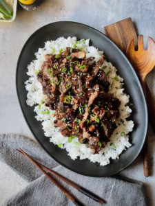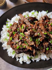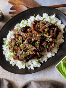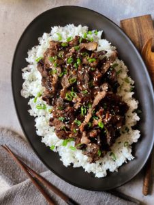 This delicious beef pairs really well with fluffy rice, buttery noodles and stir fried or roasted vegetables. I like to garnish the bulgogi with thinly sliced green onions and white sesame seeds before serving.