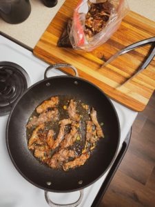 Place a large skillet or grill pan over medium to medium high heat and add about 1/2 inch of vegetable oil into the skillet. Once the oil is very warm, use a set of tongs to carefully add strips of the marinaded beef into the skillet. Cook the beef, turning occasionally, until both sides are lightly charred and then transfer the seared beef onto a plate.