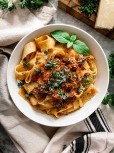 Your bolognese should be thick and super flavorful after simmering for 90 minutes. When you are ready to enjoy, make some of your favorite pasta (I highly recommend a thick pappardelle or tagliatelle) and toss it in a few ladles of bolognese garnished with finely shredded parmesan and fresh parsley.