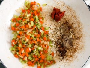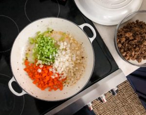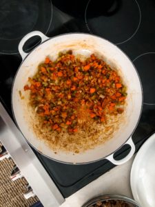 Reduce the heat to medium and add the diced celery, carrots and onions. Cook for about 5 minutes or until the carrots begin to soften and the onions are turning translucent.