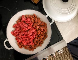 - Add 1 pound of ground beef and 1 pound of ground italian sausage into the braiser and cook until browned and cooked through