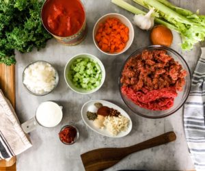 To begin, gather 1 tablespoon of extra virgin olive oil, 1 pound of ground beef, 1 pound of ground italian sausage, 3/4 cup of diced celery, 3/4 cup of diced carrots, 3/4 cup of diced yellow onion, 4 minced cloves of garlic, 2 tablespoons of tomato paste, 1/2 teaspoon of onion powder, 1/2 teaspoon of garlic powder, 1/2 teaspoon of sweet paprika, 1/2 teaspoon of red pepped flakes, 1/2 teaspoon of dried oregano, 1/2 teaspoon of salt, 1/4 teaspoon of black pepper, 1 cup of a good red wine, 35 ounces of whole tomatoes and 3/4 cup of heavy cream.