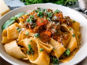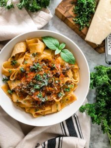 - Serve over pasta and garnish with finely shredded parmesan and finely chopped parsley