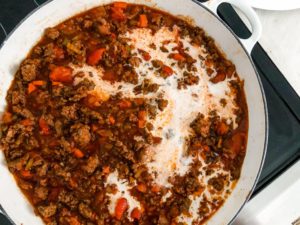 The cream is the real star in bolognese though. Although there is only 3/4 of a cup in this big braiser full of bolognese, it is just enough to set this meat sauce apart from any others. Some recipes call for milk to be used in bolognese, but I started using heavy cream a while ago and never looked back. It adds richness and the slightest hint of tang that I (and everyone I make this for) absolutely love.