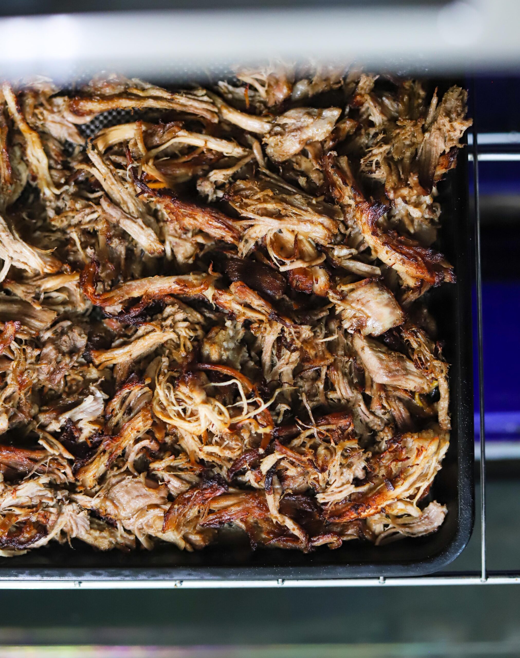 … then spread some of the shredded pork over a baking sheet and broil it until all of the edges are crisp and caramelized. The more crispy you want it, the more you’ll want to mix it and broil it… mix it and broil it… repeating this until all of the shreds are golden brown.