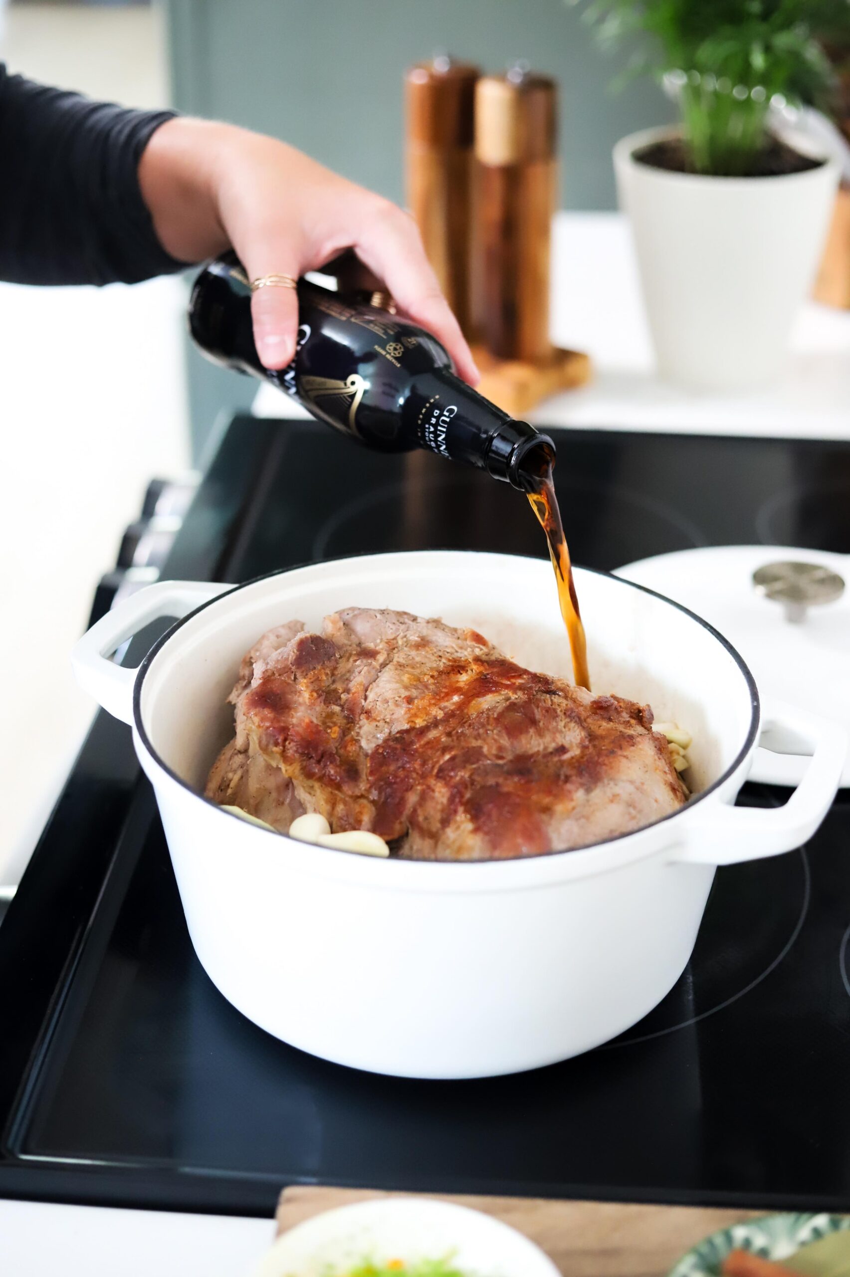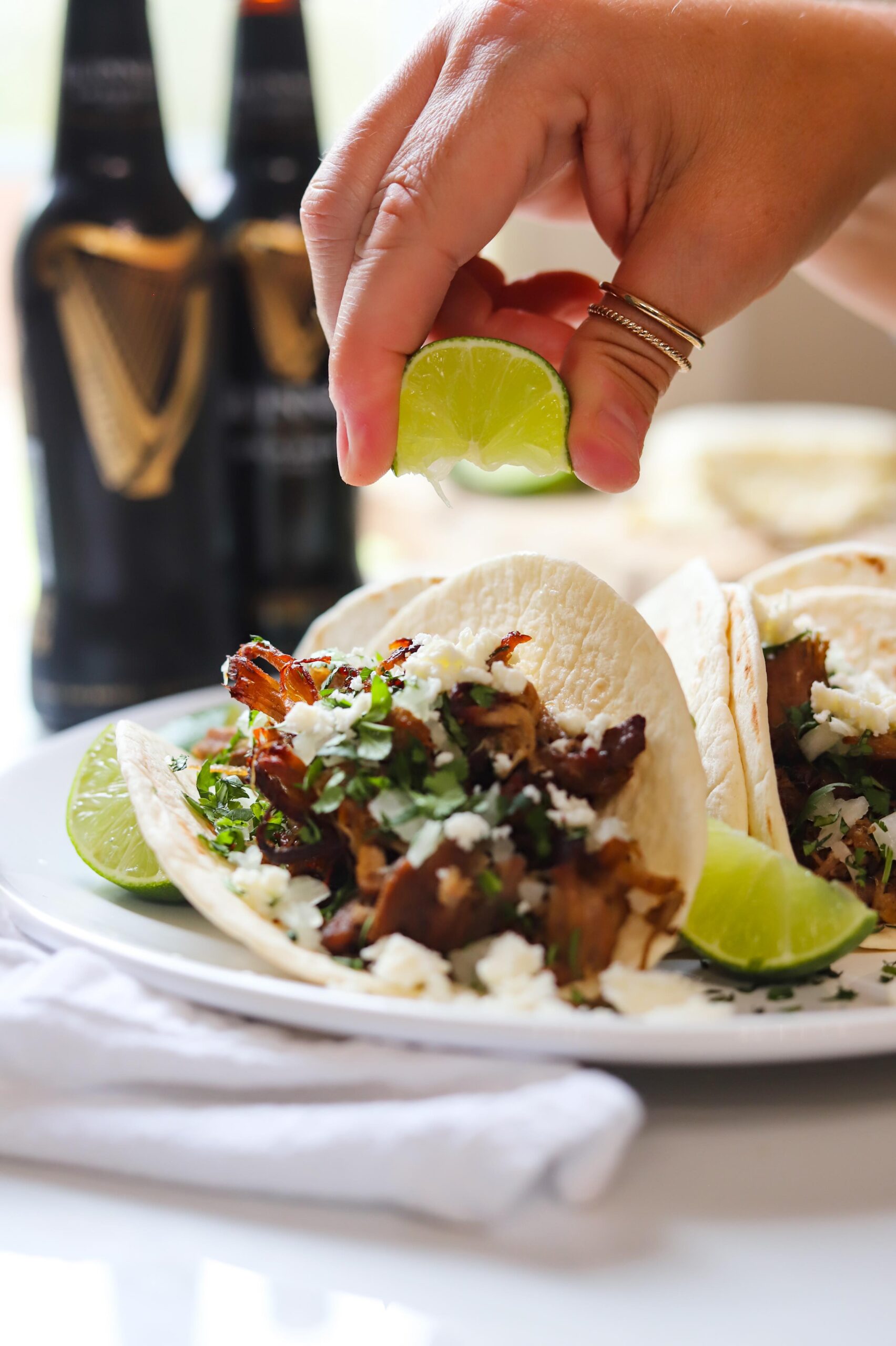 - Add 1 tablespoon of cumin, 2 teaspoons of dried oregano, 1 cinnamon stick, 3 bay leaves, 1/2 cup of fresh orange juice, 1 tablespoon of fresh orange zest, 1/3 cup of fresh lime juice, 1 tablespoon of fresh lime zest and 15 ounces of Guinness