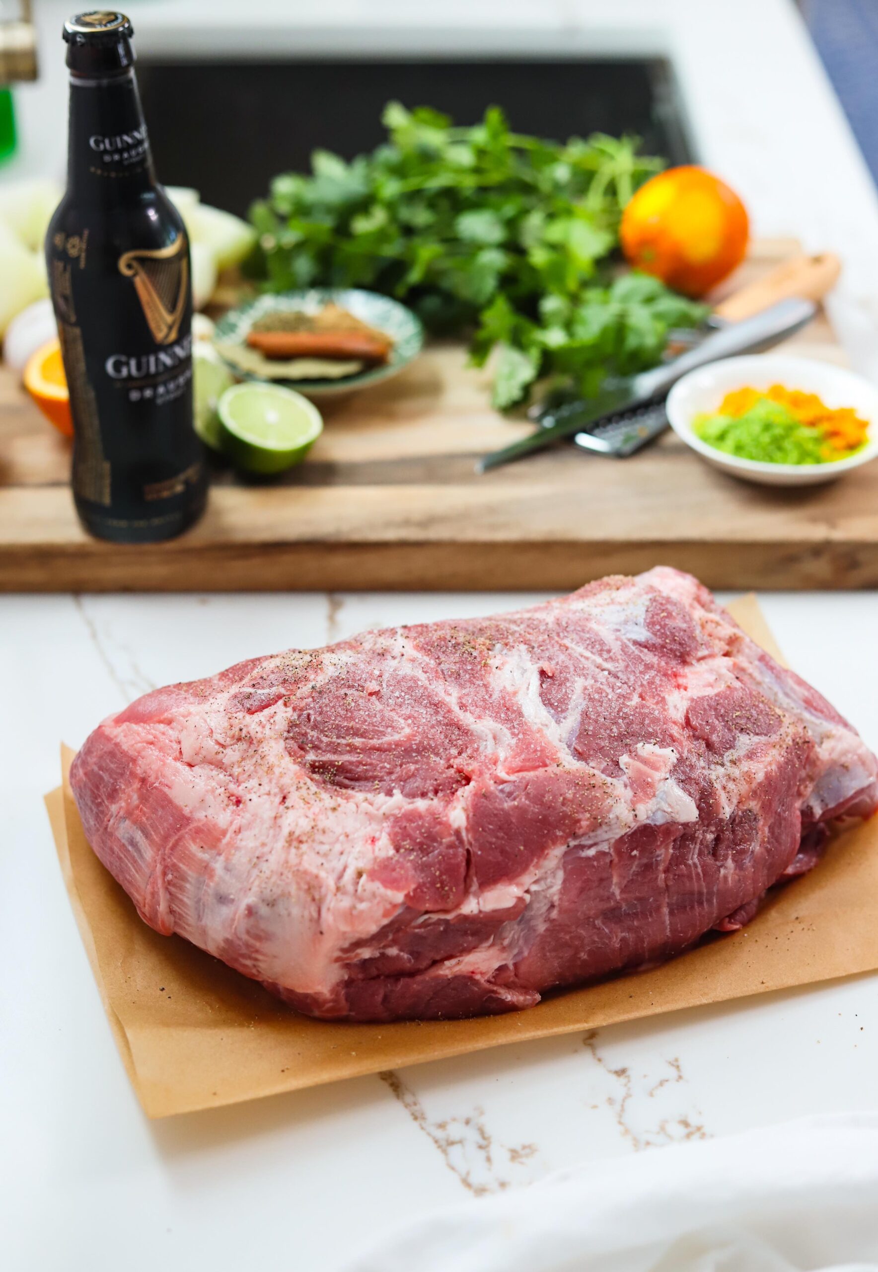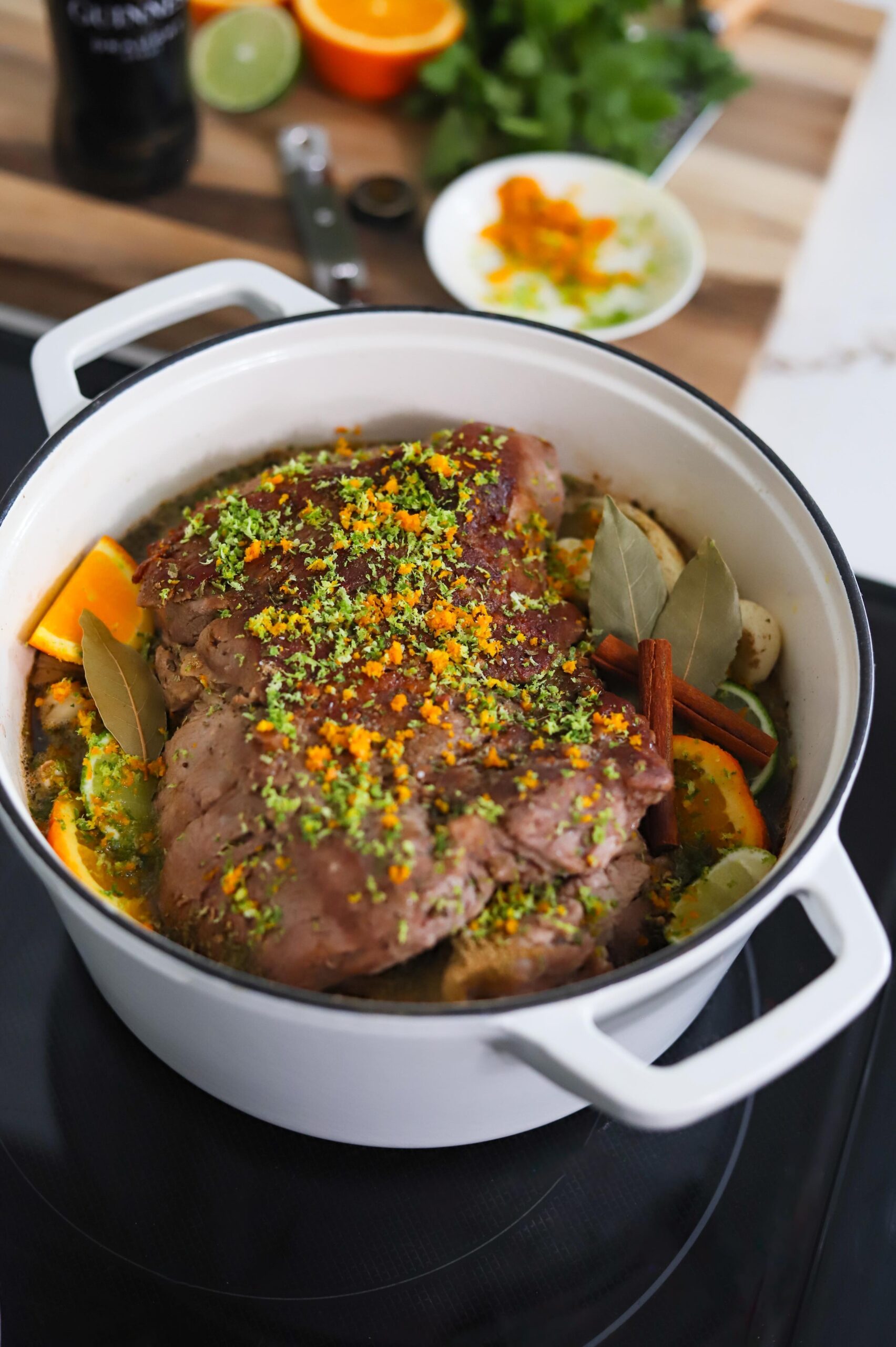 Nestle all of the cloves from a large bulb of garlic and 2 large quartered yellow onions along side the seared pork shoulder. Sprinkle a tablespoon of cumin, 2 teaspoons of dried Mexican oregano, a tablespoon of fresh orange zest and a tablespoon of fresh lime zest over the pork, add a large cinnamon stick and 3 bay leaves in there and pour 1/2 cup of fresh orange juice, 1/3 cup of fresh lime juice and 15 ounces of Guinness (or your favorite stout or porter) into the pot.