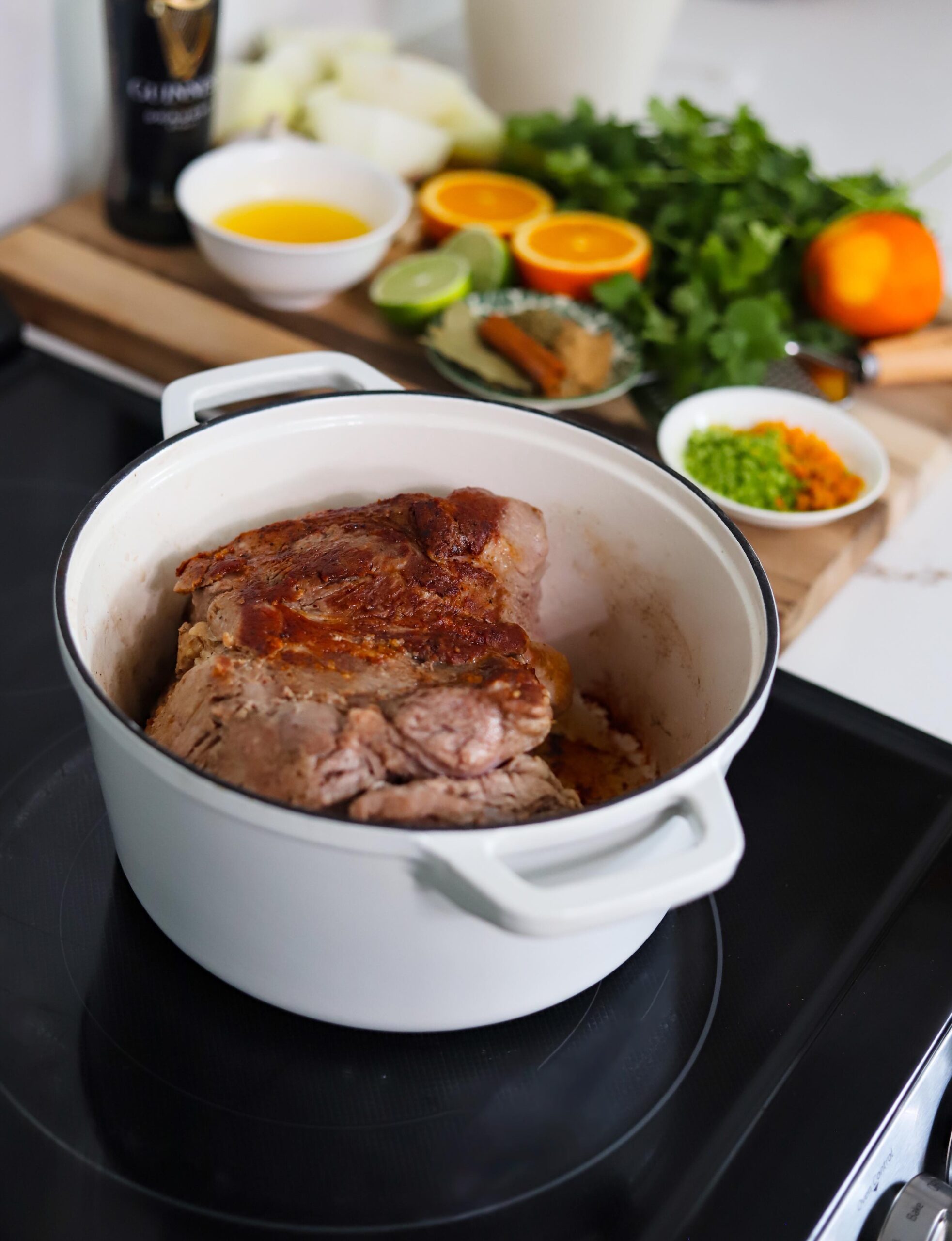 - Sear the seasoned pork shoulder on all sides until deeply golden brown
