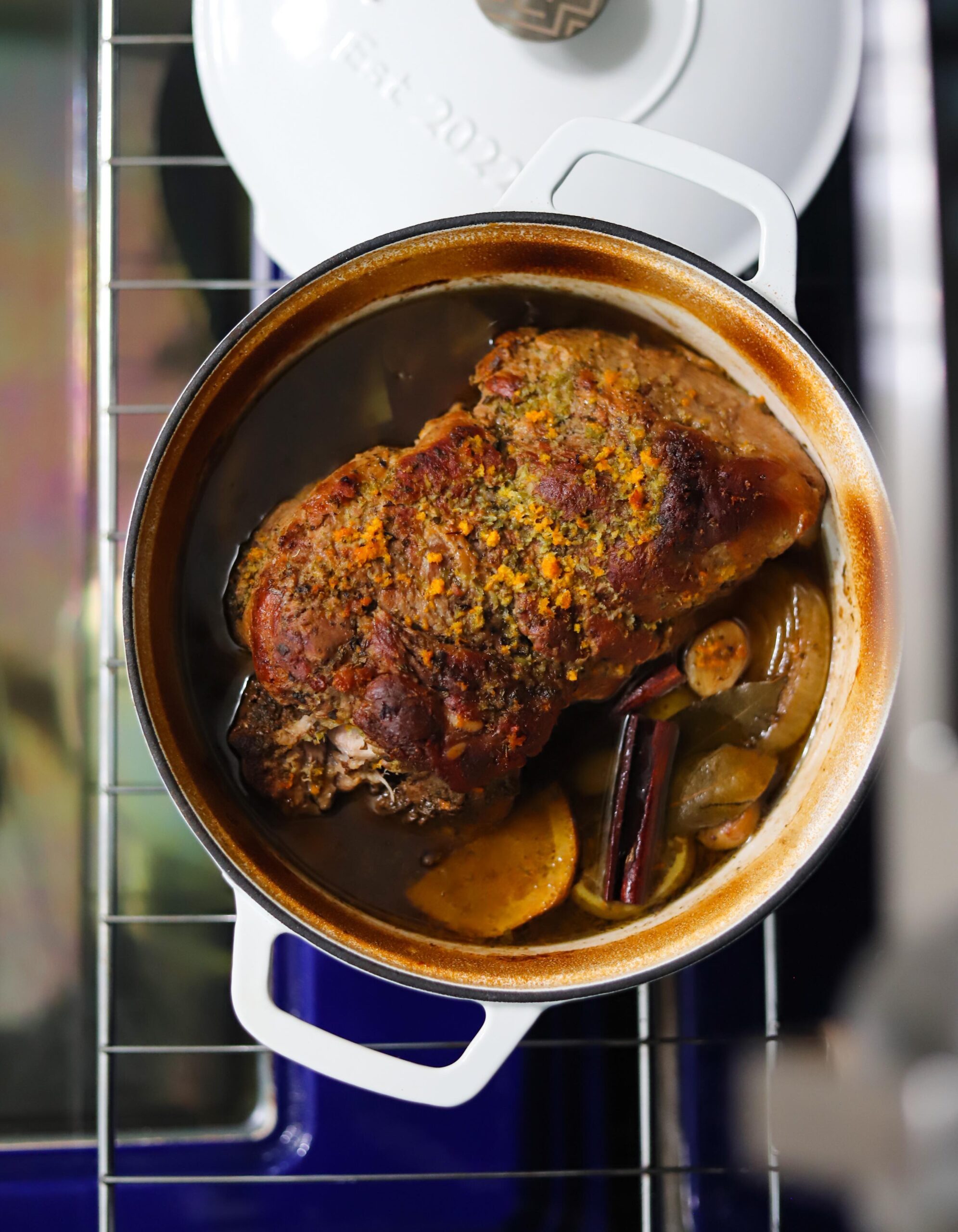 - Cover the pot and braise in a 325° oven for 3 to 3 1/2 hours
