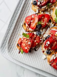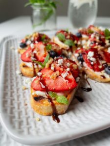 Drizzle some balsamic glaze over the berries and then sprinkle each crostini with finely chopped walnuts and a little sea salt and black pepper, especially if your berries are very sweet.