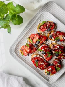 You have some options when it comes to the crostini. I usually thin slice a skinny loaf of italian bread or a french baguette, drizzle the slices lightly with olive oil and toast them on a grill pan or flat skillet until crisp. You could also place the lightly oiled slices onto a baking sheet and bake them at 350 degrees until crisp (about 10-12 minutes) or you can buy ready crisped crostini at your local grocery stores bakery counter and make this recipe even easier.