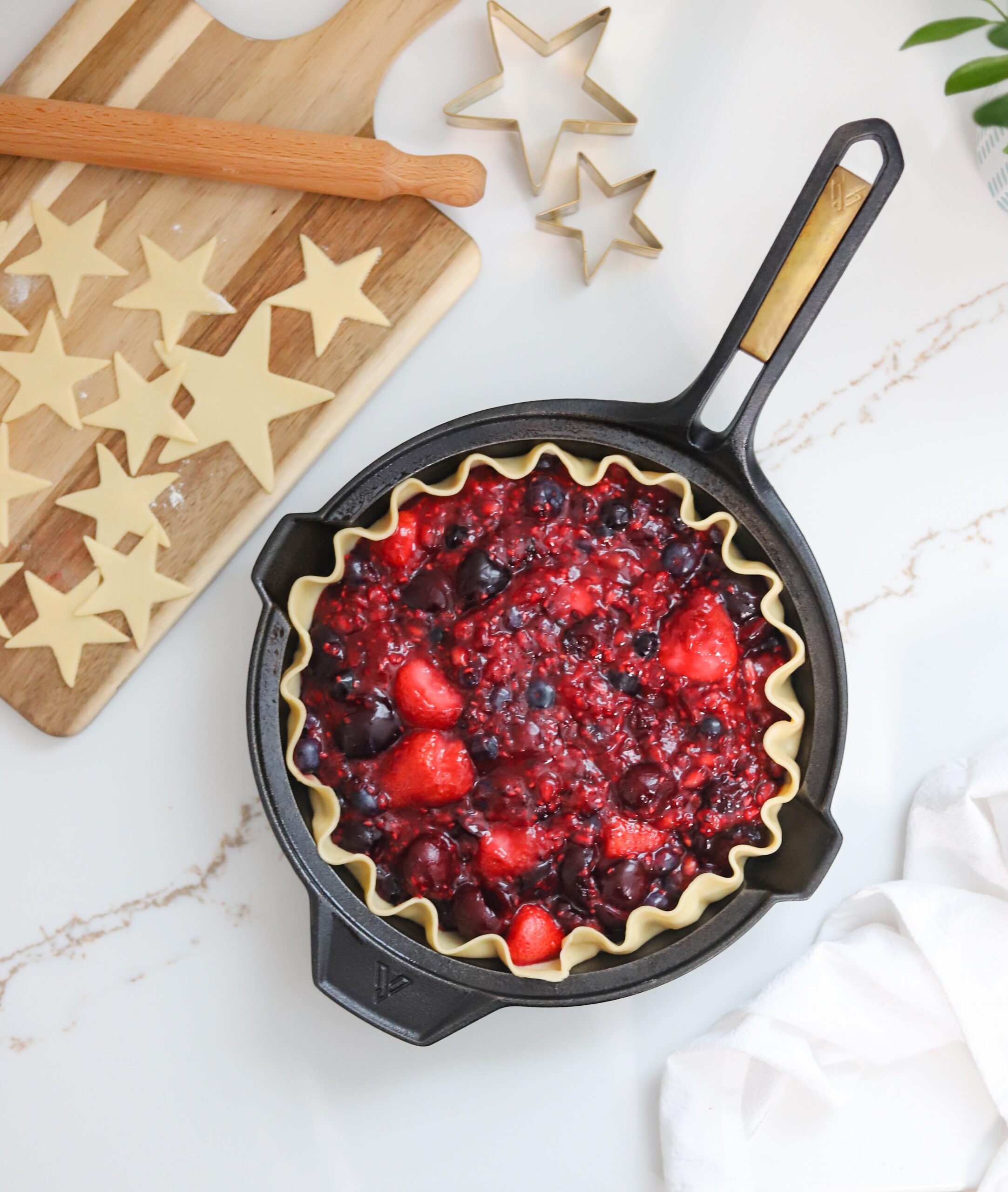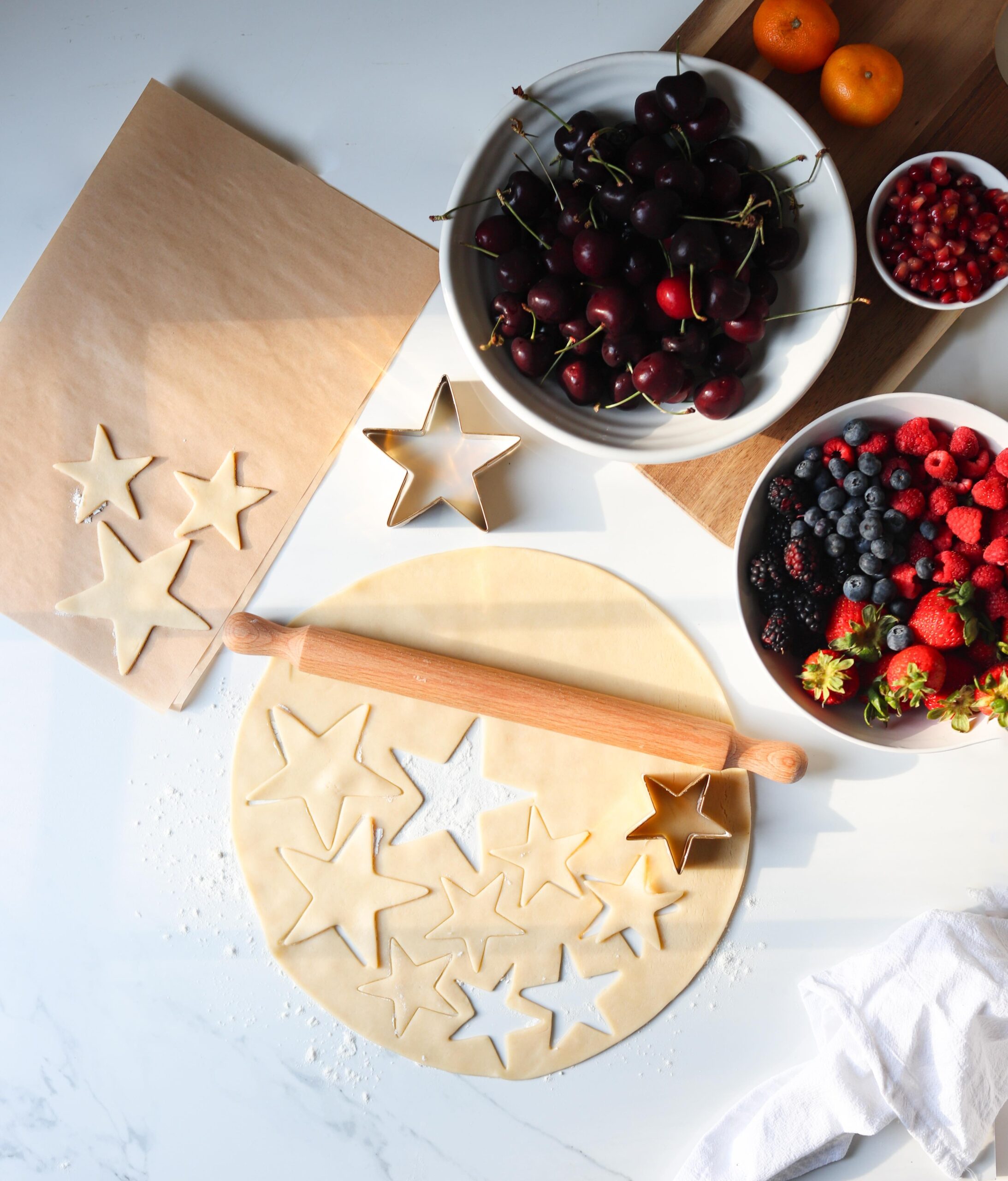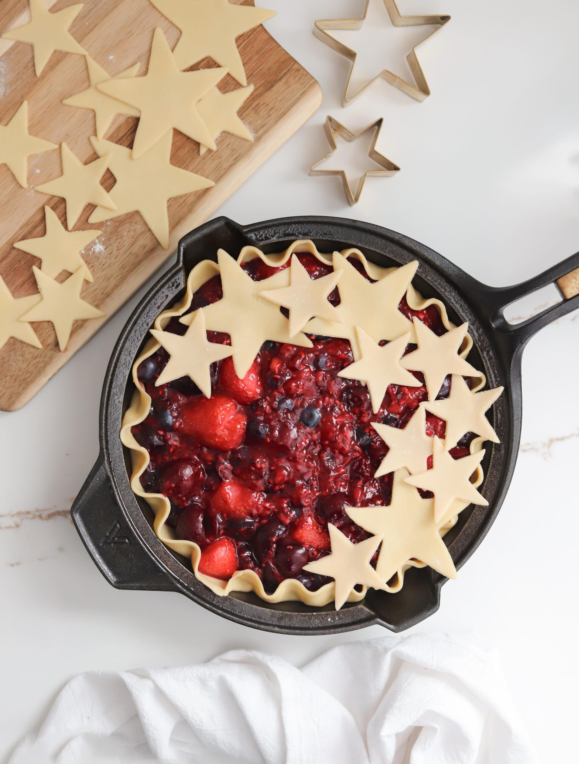 If you are planning on decorating the top of your pie with something special like a whole bunch of beautiful stars then I recommend cutting them out and transferring them onto a sheet of parchment paper to chill along with the other dough. Sometimes it can take a while to cut out your lattice strips (or stars in this case) and the dough can become soft and too pliable during this time. If you cut out your shapes ahead of time, they will be easier to work with once you are ready to add them over your filling and they will hold their shape better as they bake too.