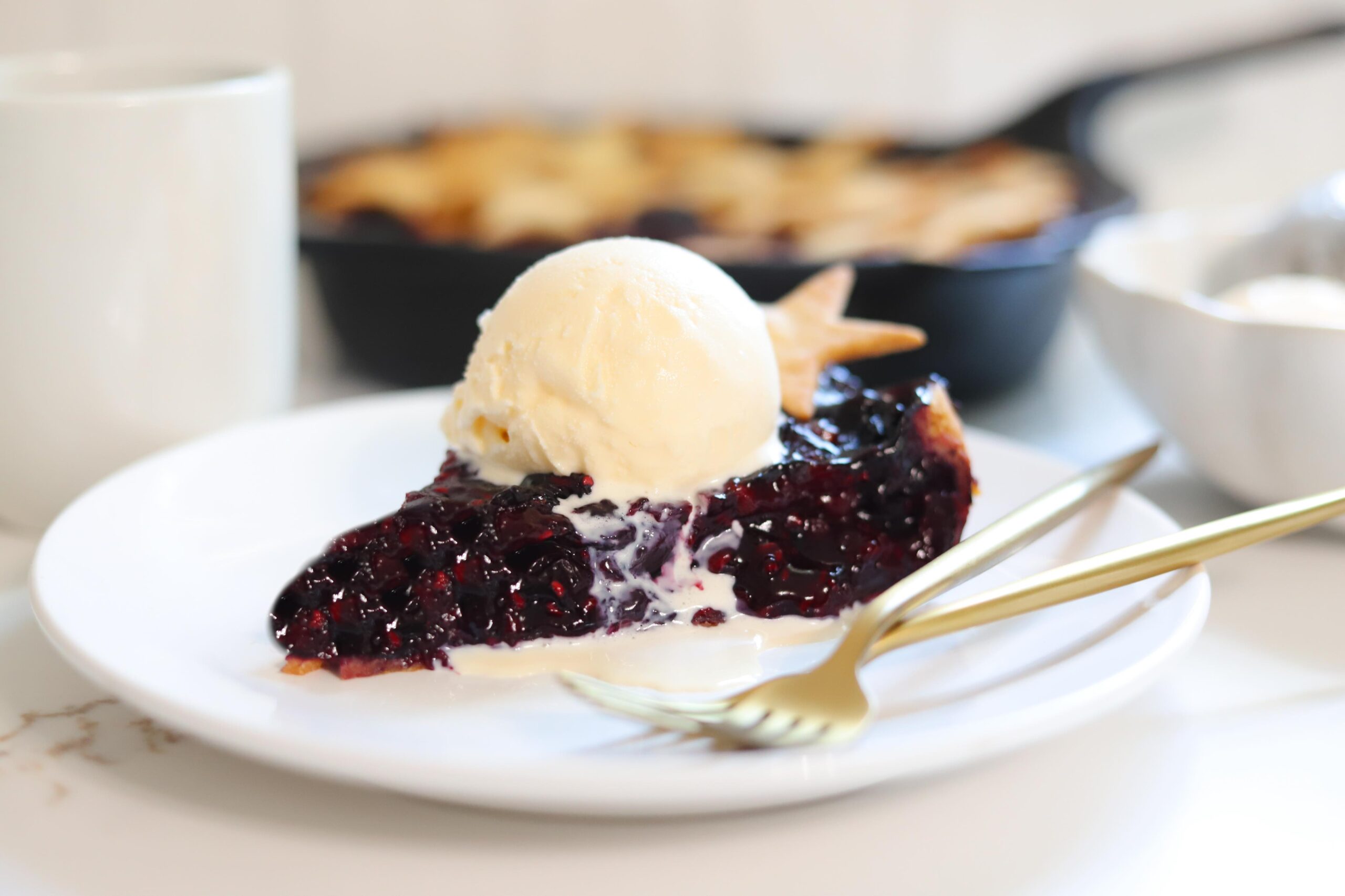 Once it has cooled, slice up your berry cherry pie and add a big scoop of vanilla ice cream.