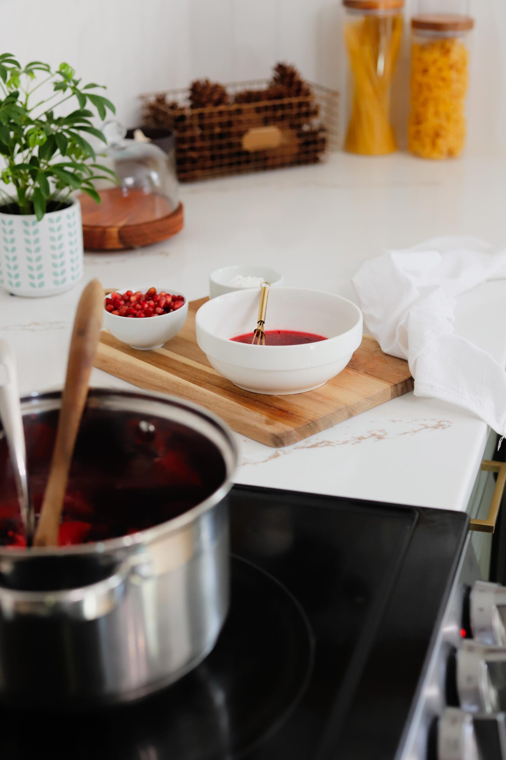 - Ladle some of the berry juices into a small dish and whisk in 1/4 cup of cornstarch until smooth