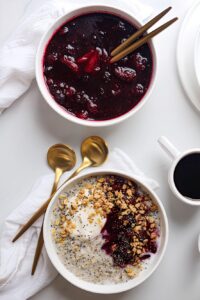 Use this berry compote on your breakfast, as a mid day snack or for dessert. I make it any time I have fruit in the refrigerator that won’t last much longer: use it to make a compote and you just extended its life by two weeks! Smart and delicious…