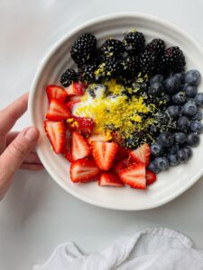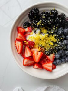Start by gathering your fruit. You will need about 3 heaping cups of fruit in total. Today, I am using 3/4 cup each of strawberries, blueberries, blackberries and raspberries. Being exact on these measurements is not too important, just be close. In addition to the fruit, you will need 1-4 tablespoons of granulated sugar, a teaspoon of vanilla extract, a teaspoon of lemon zest, 1 tablespoon of cornstarch and 3 tablespoons of cranberry juice.