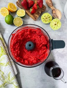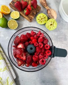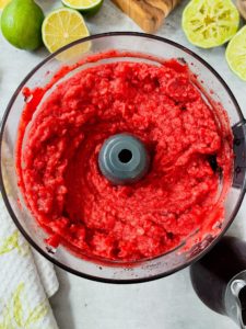 Once the berries are frozen, place them into a high speed blender or food processor along with 1/2 cup of fresh lime juice and 1/4 cup of cranberry juice. I usually start by pulsing the mixture a few times to get things moving and once the berries start breaking apart a bit, turn the food processor to medium speed and blend until smooth.