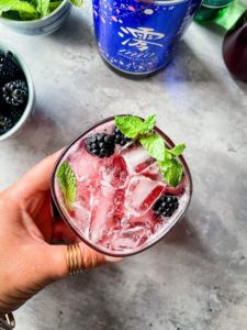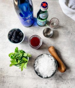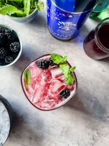 You will need some blackberry simple syrup, fresh blackberries, fresh mint, sparkling water and saké to make this beautiful cocktail.