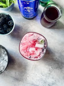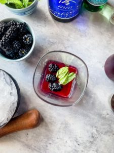 - Add 1 1/2 ounces of blackberry simply syrup, 3 fresh blackberries and a large sprig of fresh mint into the bottom of a glass and lightly muddle to slightly break up the mint and blackberries