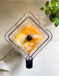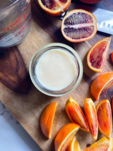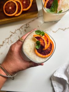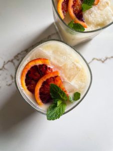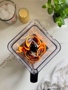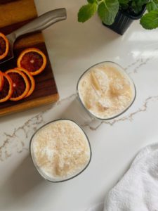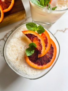 Pour this creamy, slushy drink over some ice cubes or straight into glasses and garnish with a few slices of beautiful blood orange and maybe a little sprig of something green like mint or thyme…