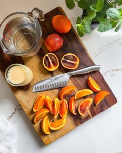 - Thoroughly scrub 3 medium blood oranges and cut them into chunks