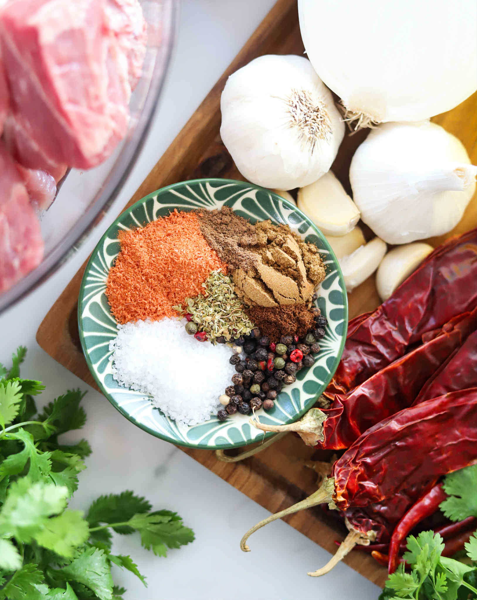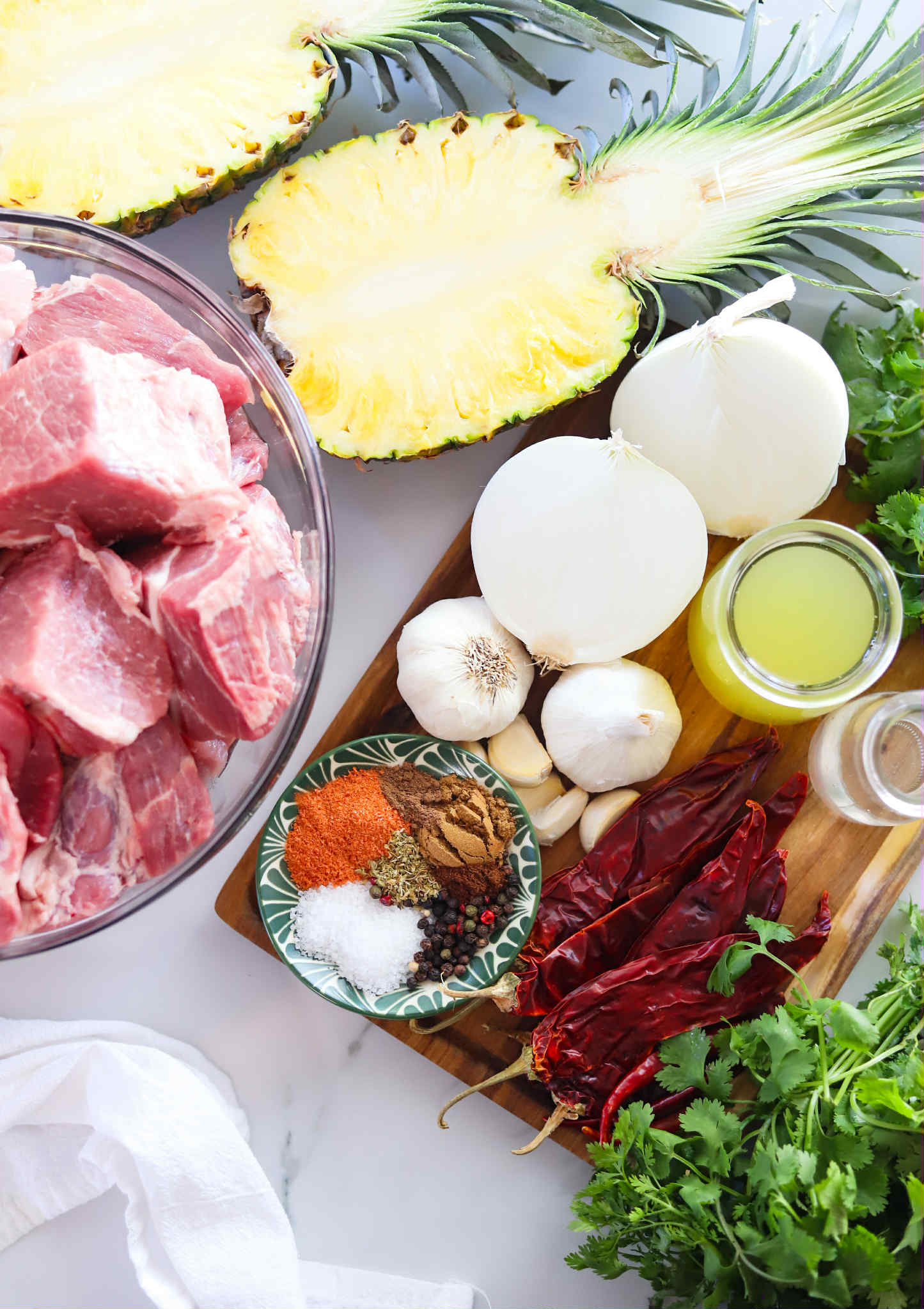 Most of the flavor is in this marinade and we are going to use it to both marinate the pork and as the braising liquid. You’ll need some dried guajillo chiles, dried chiles de árbol, garlic cloves, pineapple juice, vinegar, salt, black peppercorns, achiote powder, Mexican oregano, cumin and all spice.