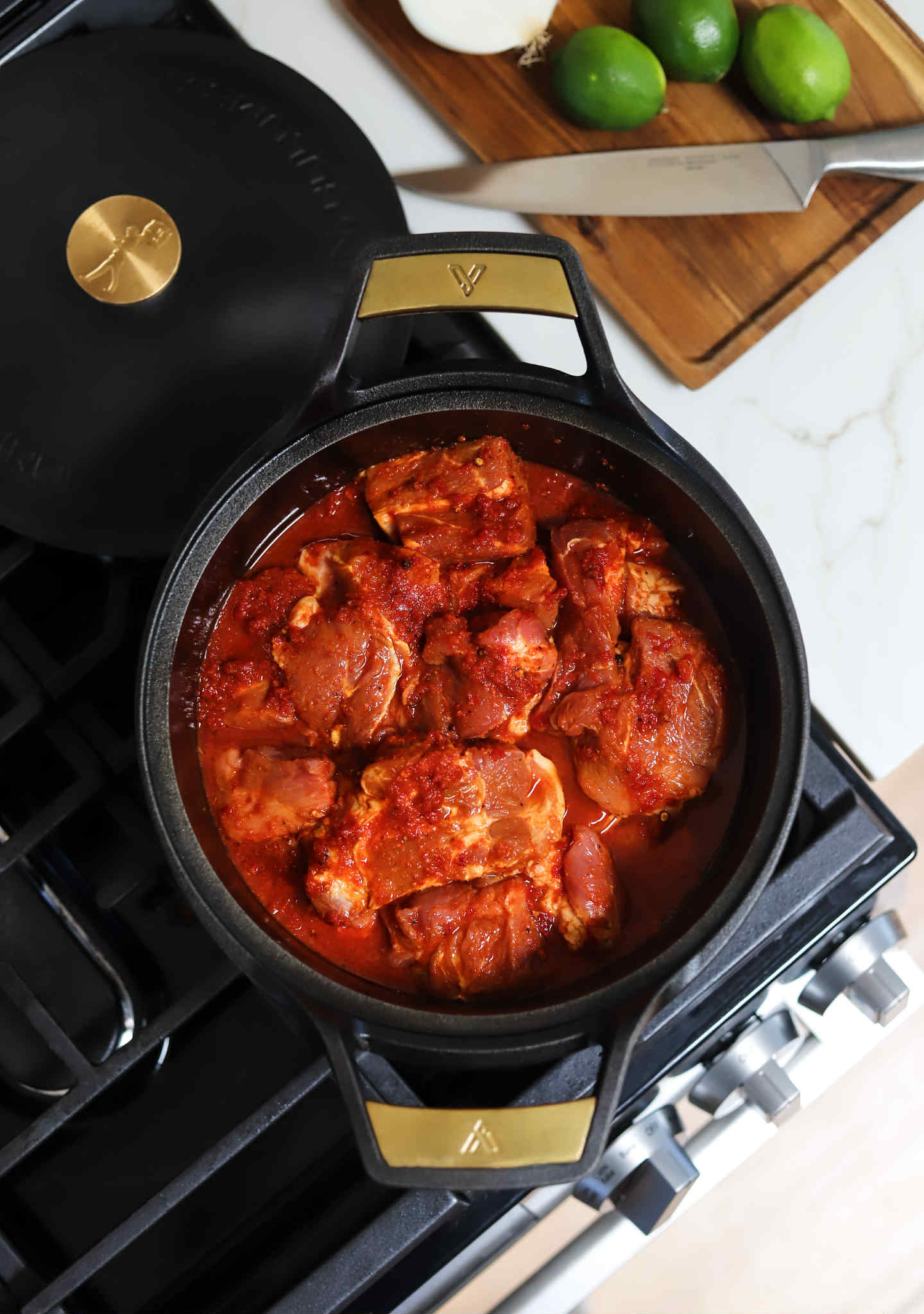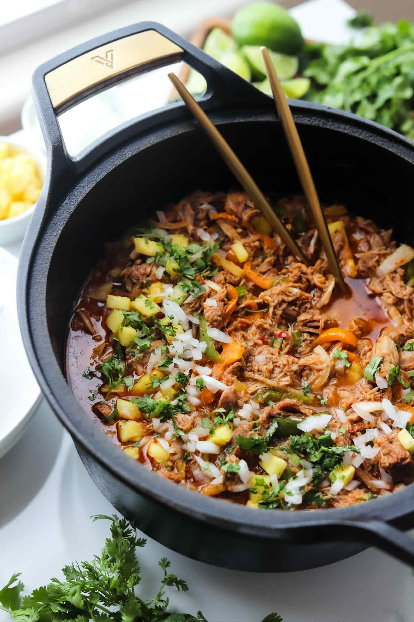 There is something really special about the sweet of the pineapples and the heat of the chilis in al pastor. It is definitely in my top 3 mexican protein choices, but making it authentically can be a little labor some. Al pastor is usually made on a vertical spit and while there are some cool cheats that you can do to create a makeshift one, you can also create a really fabulous al pastor right in a braiser or dutch oven.