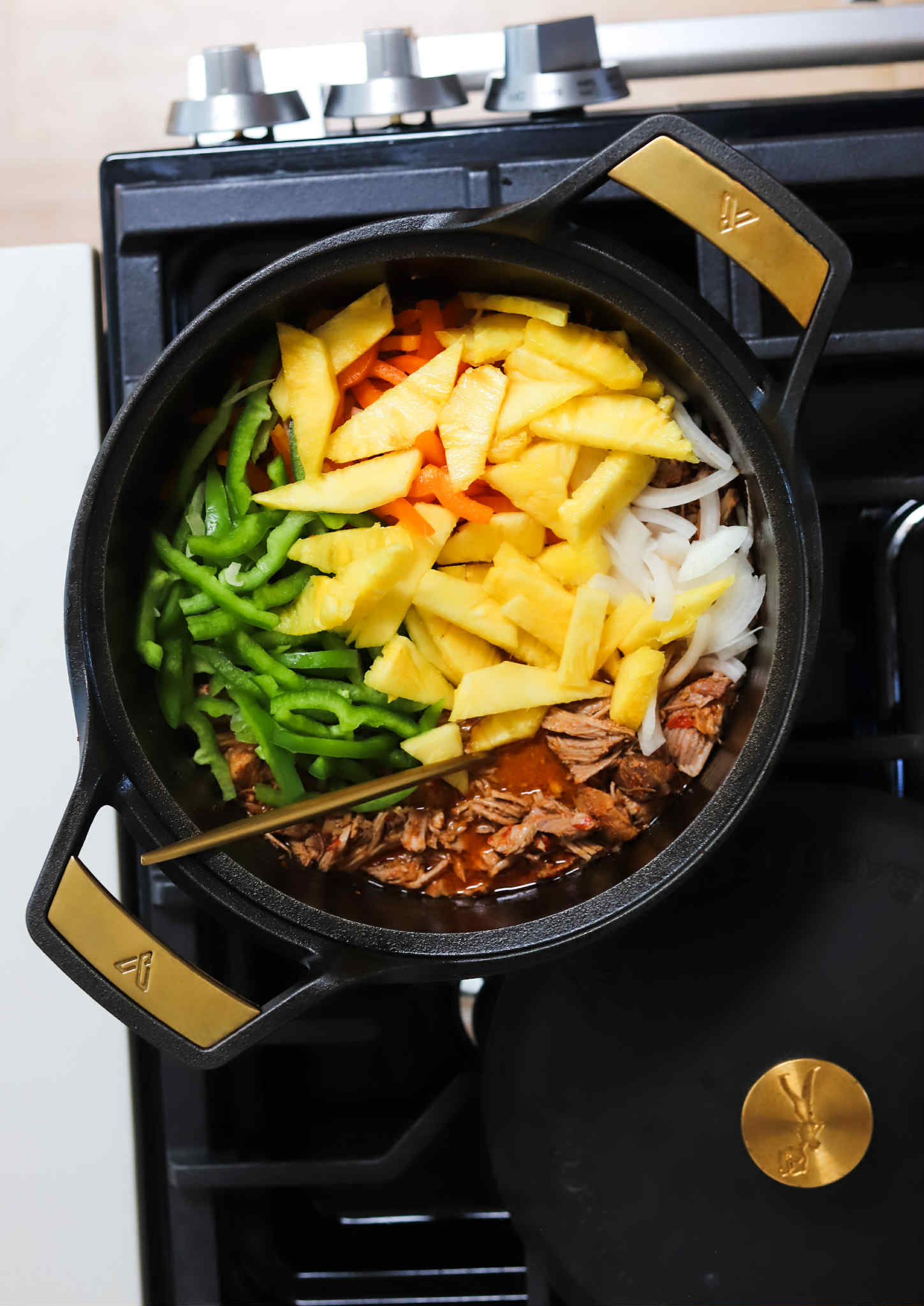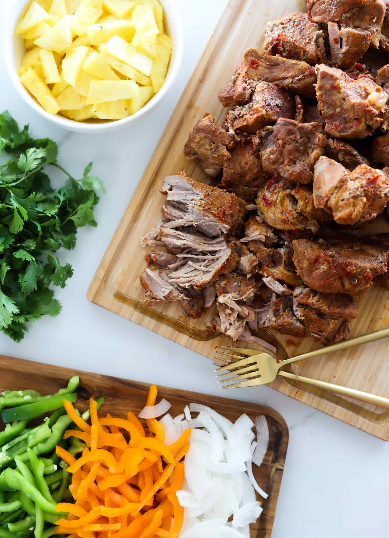 Shred the pork and thinly slice 2 large sweet bell peppers, 1/2 of a white onion and 1/2 of a pineapple.