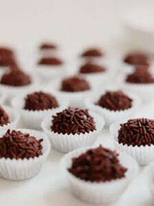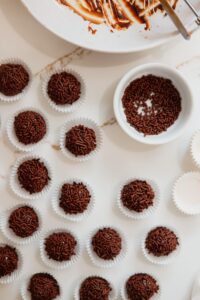- Place the shaped brigadeiro into mini cupcake liners or mini paper cups