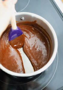 Cook over medium low heat and as soon as it gets warm, begin stirring consistently until it thickens to the point where it will hold its place in the bottom of the saucepan for a few seconds when you drag a spatula down the center. See how in the photo above you can see the bottom of the saucepan? When the mixture has reached this consistency, it is ready to be transferred off of the heat. If you drag the spatula down the middle and the mixture immediately returns back together, cook for another 30 seconds or so and try the spatula drag again.