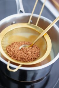 - While the mixture is warming, sift 1/4 cup of cocoa powder and a pinch of salt into the saucepan and stir to combine