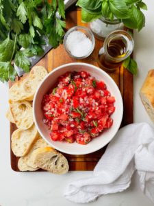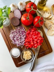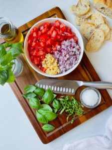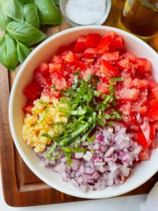 Dice your tomatoes and onion up small and using a sharp knife, chop your basil leaves into long ribbons or a 1/2″ dice. Finely mince the garlic cloves and put everything into a bowl and toss until fully combined.