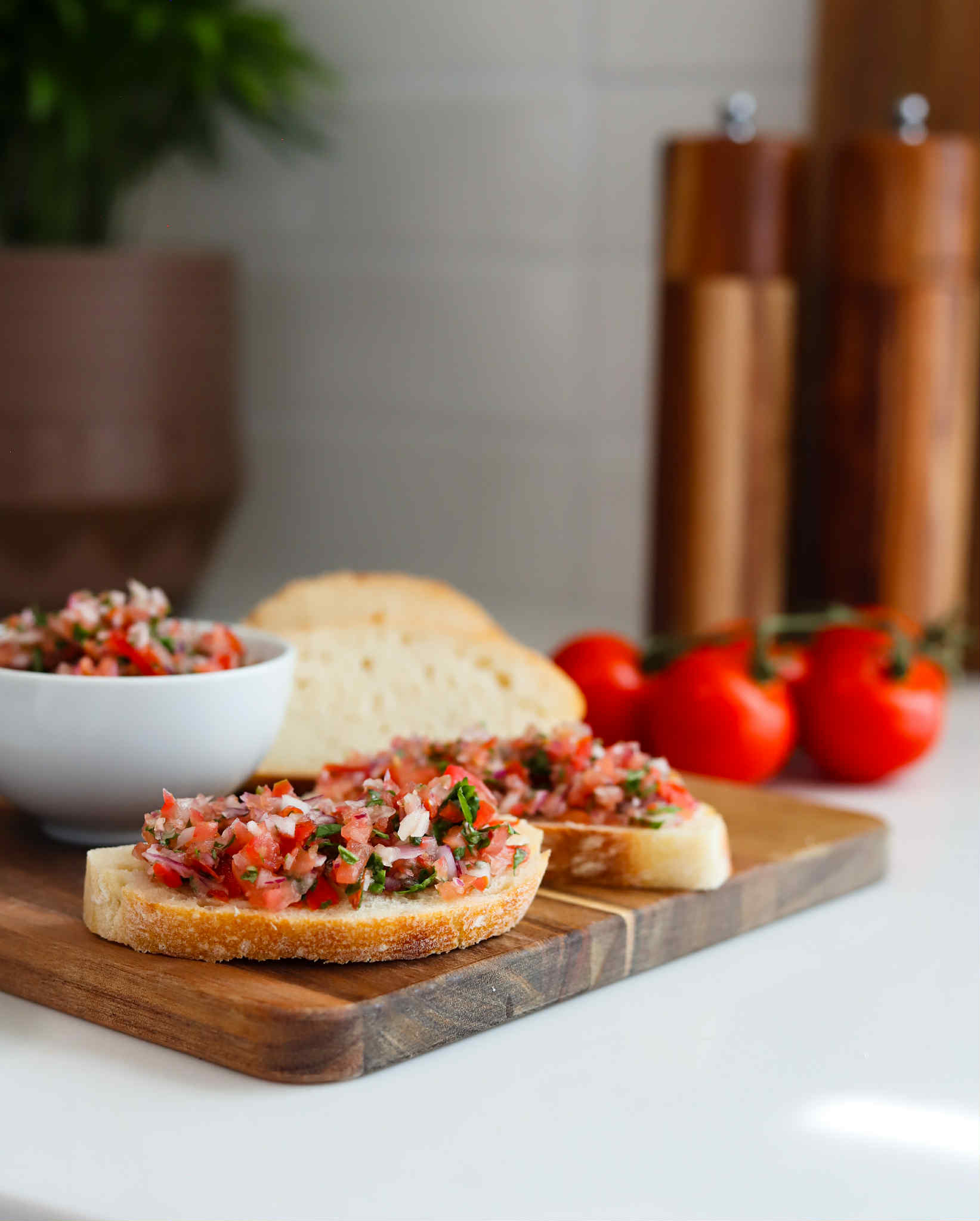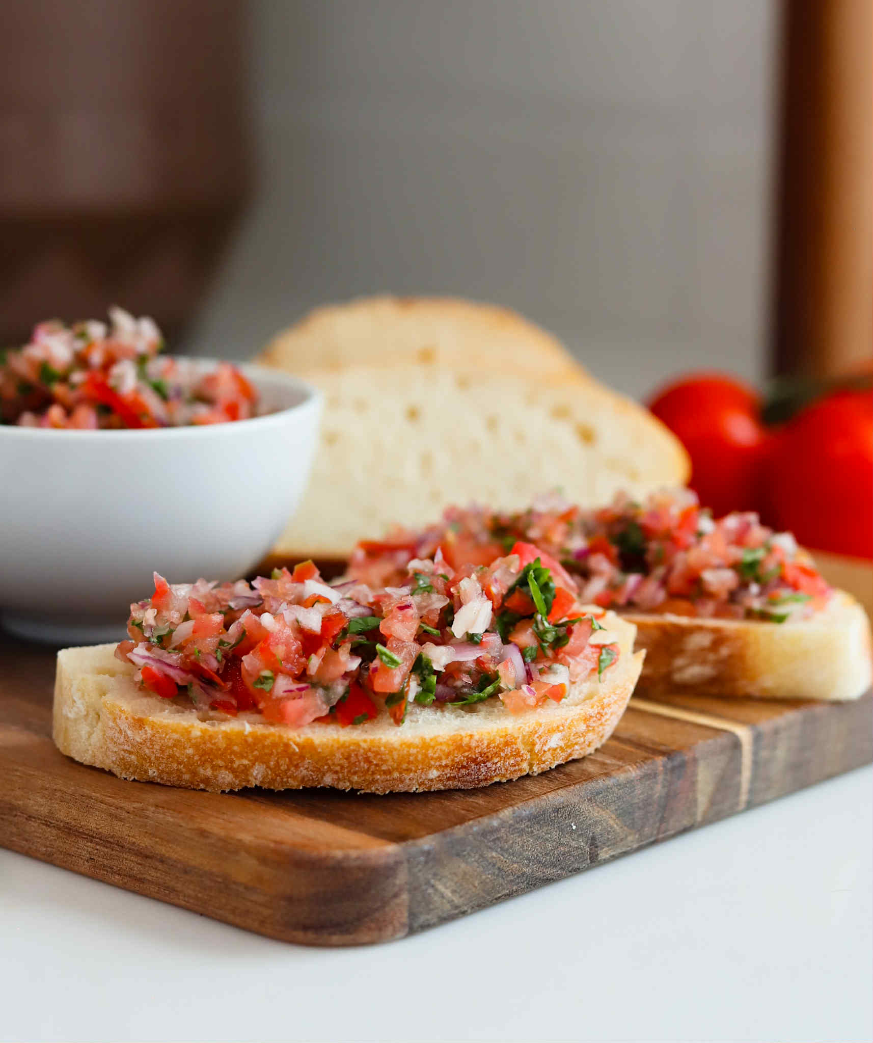 Traditionally, the bread is brushed with olive oil, grilled and then rubbed with garlic before being topped with bruschetta, but todays recipe is a little more simple with less steps, but plenty of flavor…. perfect to whip up quickly before a holiday get together or dinner party.