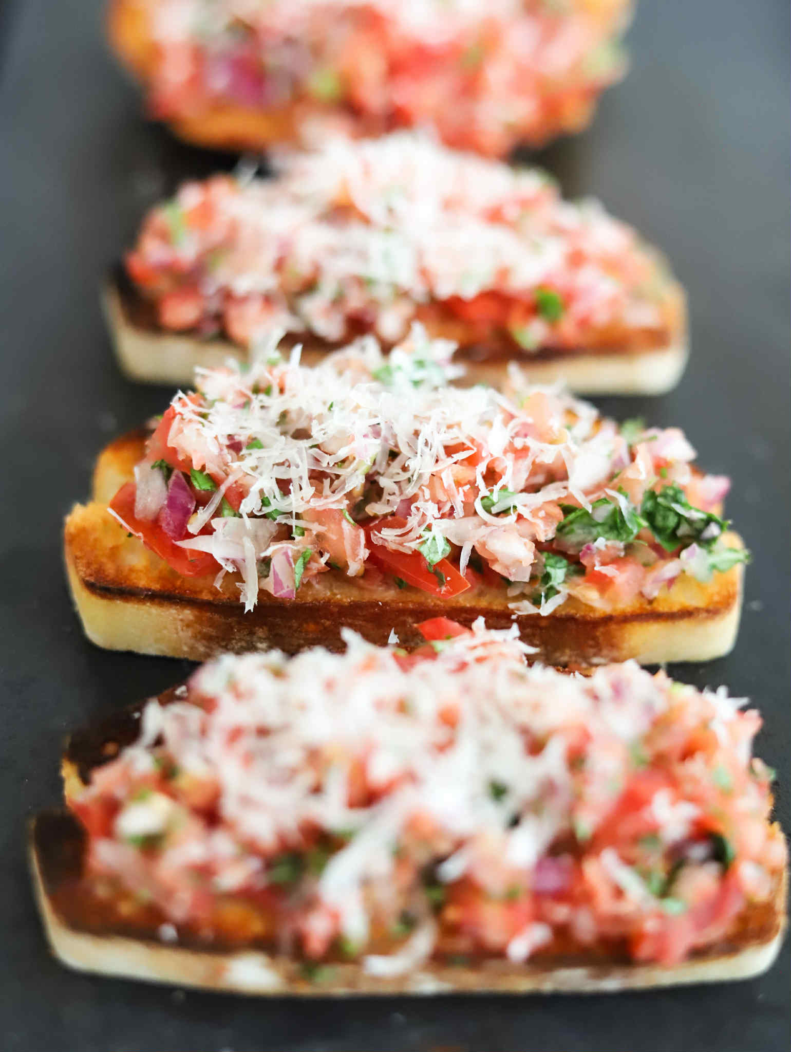 You can also bake them in a 425 degree oven until the parmesan starts to melt and the bread is crispy. This usually takes 8-10 minutes, but may vary depending on how thickly you sliced your bread and how much bruschetta you topped it with.