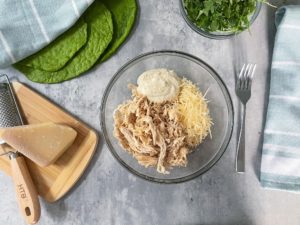 In a mixing bowl, combine 4 cups of shredded chicken with 1 cup of shredded parmesan and 1/2 cup of creamy caesar dressing. If you want to make your own creamy caesar, check out my creamy caesar dressing recipe. It is tangy, salty and full of parmigiano reggiano… you are going to love it.