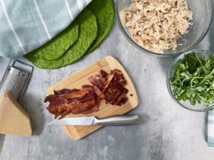 Chop 6 slices of crispy bacon into 1/2′ inch pieces and gather 4 large flour tortillas (may I suggest my green spinach and herb tortillas?) and 2 cups of arugula or your favorite leafy green.