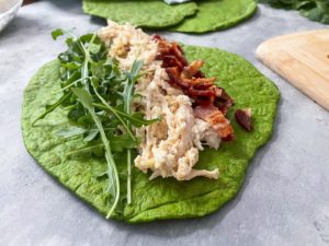 - Assemble each wrap by adding 1 cup of the shredded chicken mixture, some of the crumbled bacon and arugula into the middle of the wrap