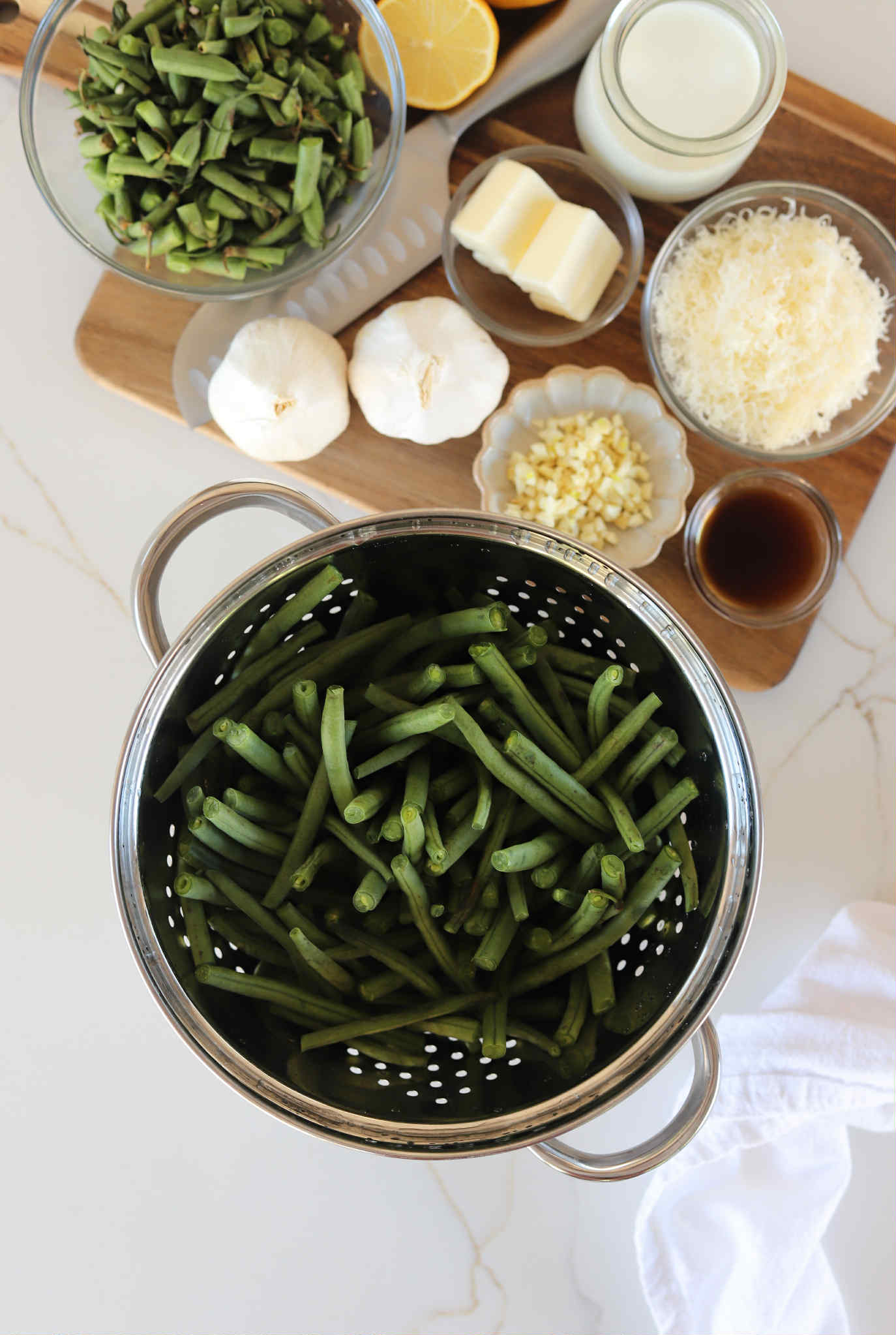 Place a skillet over medium heat and add 2 tablespoons of butter and 2 cloves of finely minced garlic. Cook the garlic while stirring for about 60 seconds and then add 1/2 cup of heavy cream, 2 teaspoons of fresh lemon juice, 1/2 teaspoon of Worcestershire sauce and a few cracks of black pepper. Bring the sauce up to a simmer and then add in your drained green beans.