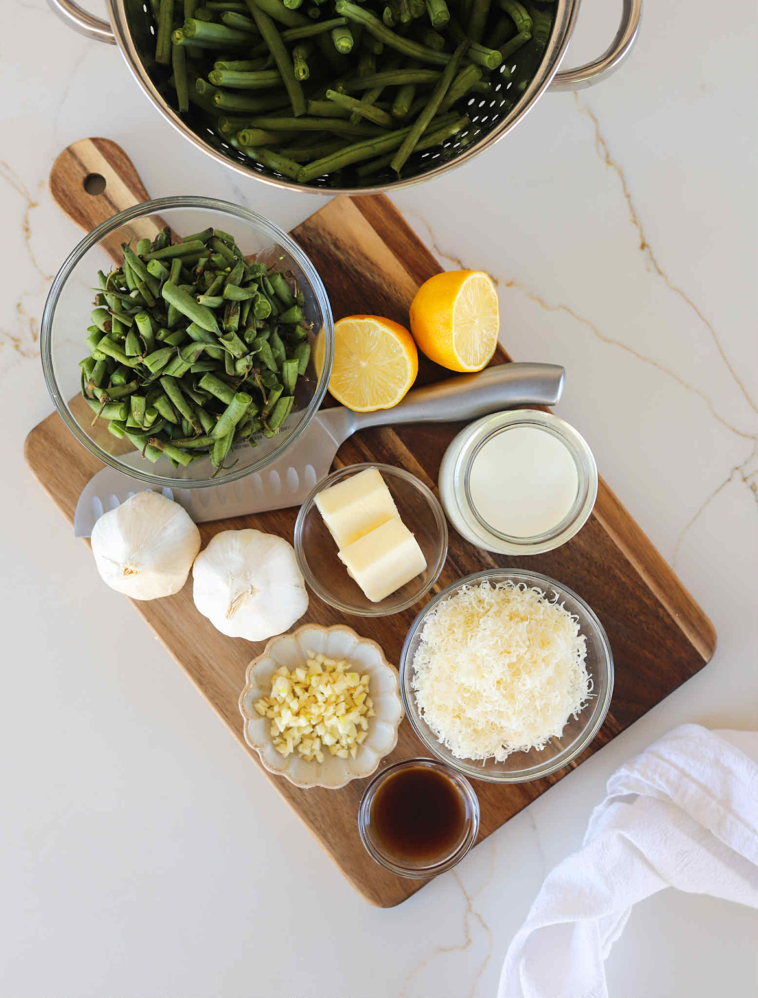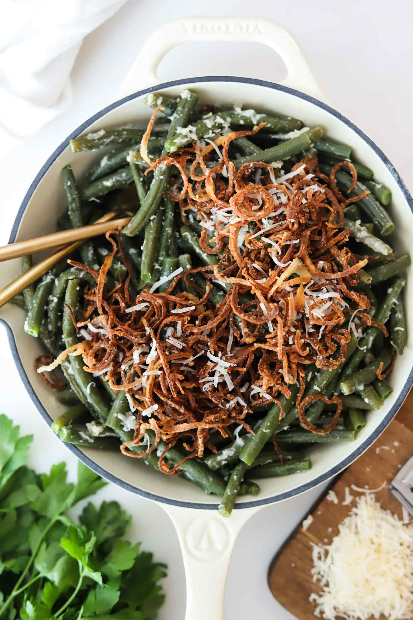 Fresh green beans tossed in a garlicky, lemony cream pan sauce with some parmesan and a crispy shallot topping. This is like a modern, light, but incredibly flavorful twist on the ol’ classic cream based green bean casserole. It brings the nostalgic vibes in a cool new dish.