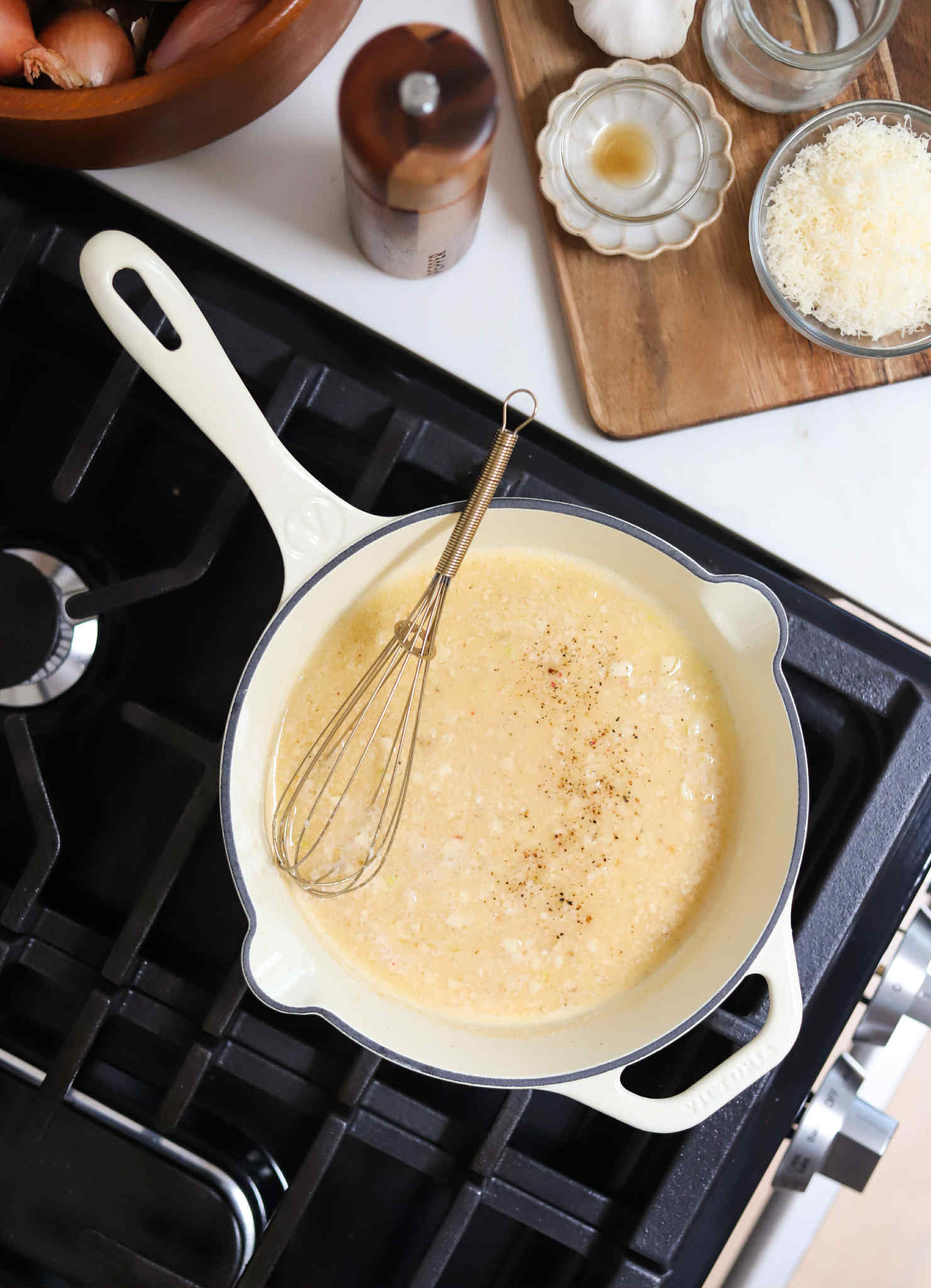 From that salty, citrusy caesar cream pan sauce to the salty crispy shallots and of course the parm… this is a fabulous side dish that would be a delicious addition to any dinner plate.