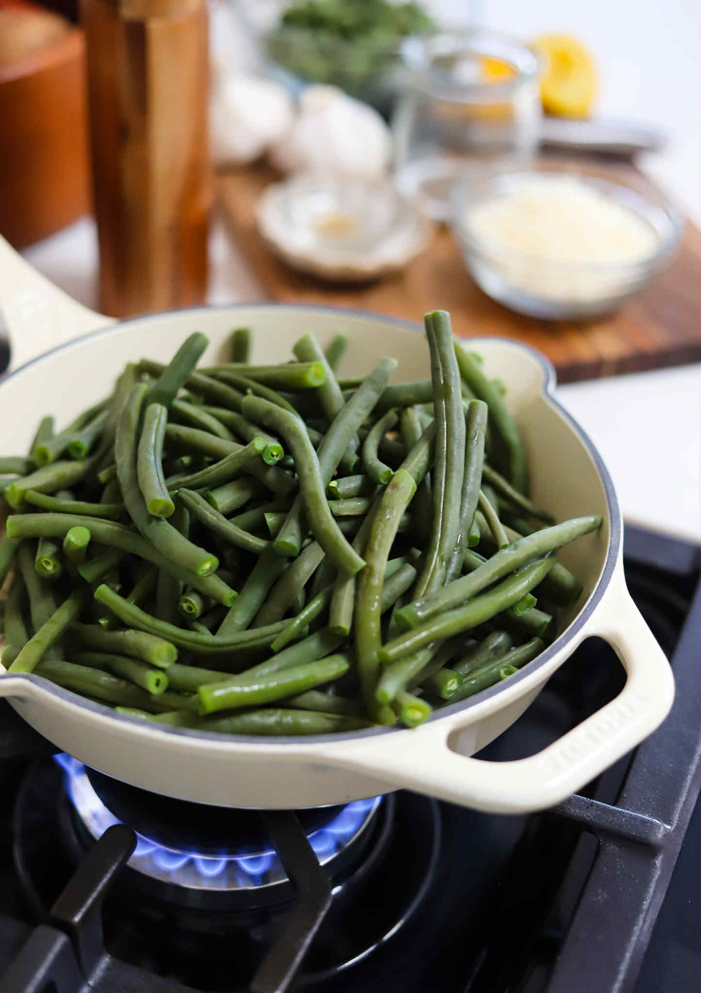 - Add 1/3 cup of finely shredded parmesan and toss until all of the green beans are coated