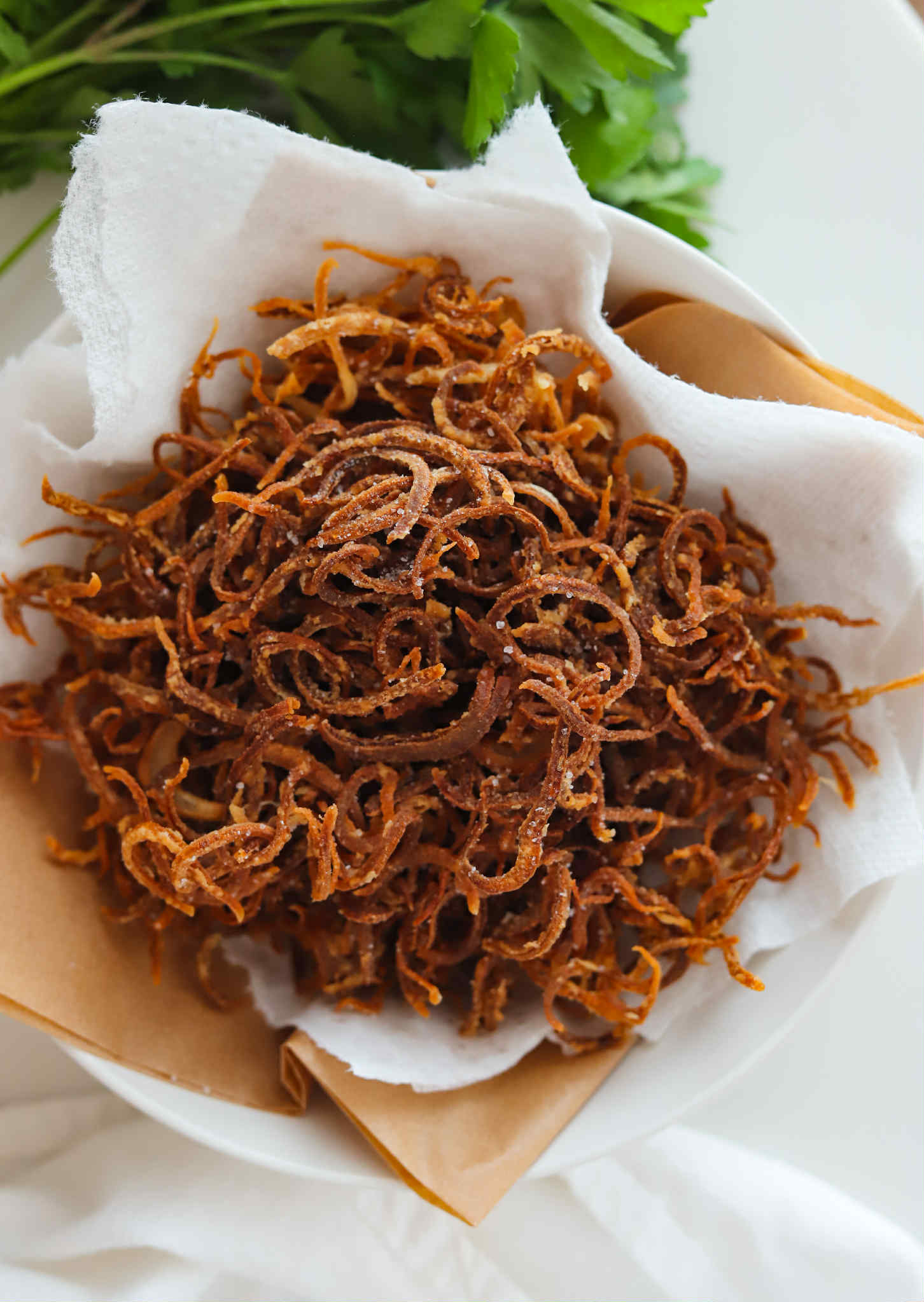Sure you could grab a bag of store bought crispy onions, but my crispy shallot recipe is super simple and ready in about 15 minutes. Plus, they are on a whole nother level flavor and texture wise than the store bought ones.