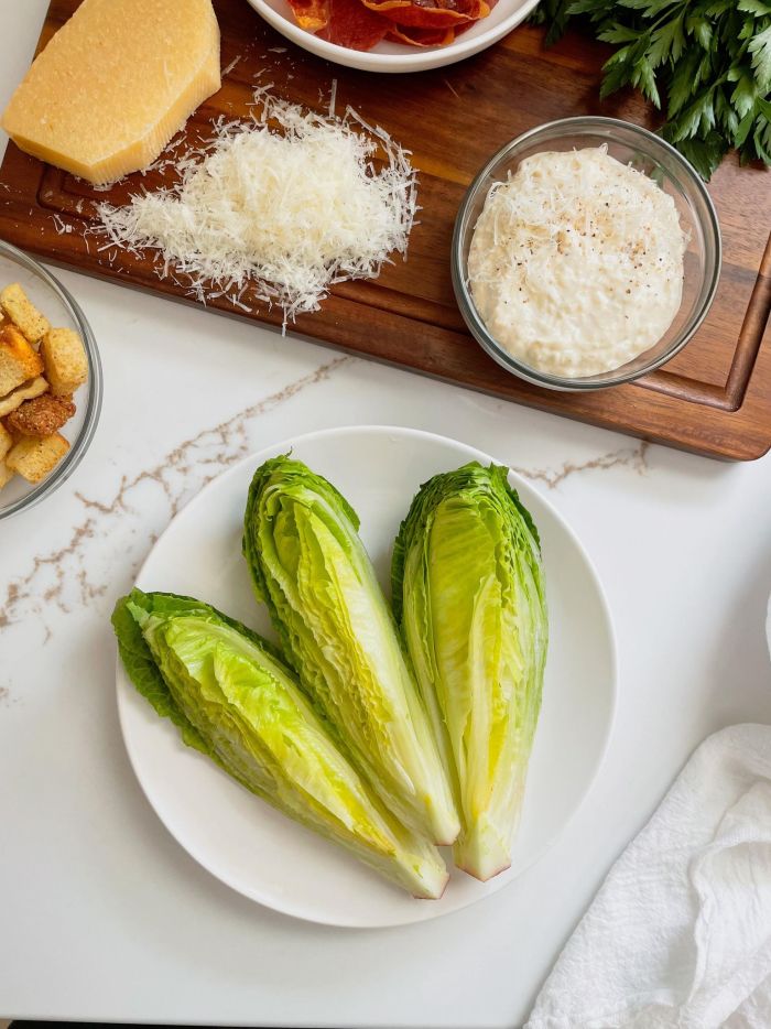 Begin by preparing your lettuce. You can use iceberg or romaine lettuce for wedge salads, but I prefer romaine for this caesar version to keep with the classic caesar elements.
