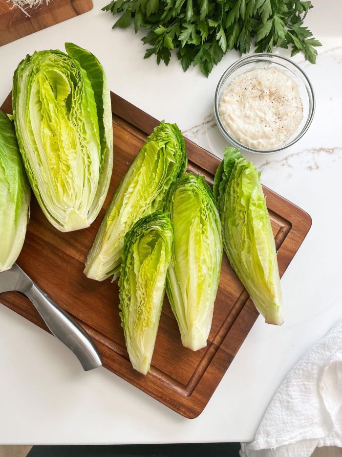 - Romaine - Slice 2 head of baby romaine lettuce into wedges leaving the root in tact. Wash the wedges and and pat dry with paper towels.