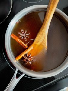 • Combine 8 cups of water with 3 ounces of piloncillo, 3 whole cloves, 2 cinnamon sticks and 2 star anise pods in a medium pot placed over medium high heat
