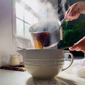 • Once the piloncillo has fully dissolved, transfer the pot off of the heat and add 1/2 cup of coffee grounds