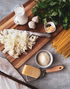 While the chicken is cooking, gather 1 large diced white onion, finely minced cloves of garlic, 2 tablespoons of butter, 2 tablespoons of all purpose flour, 2/3 cup of chicken stock, 2/3 cup of whole milk, 1/2 cup of finely shredded parmesan and 8 -12 ounces of thin spaghetti (8 ounces for 4 regular portions or 12 ounces for 4 hearty portions).