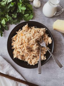 While the sauce is coming to a simmer, shred your chicken and about 1/2 cup of parmesan… or more, depending on how much you love parm. In addition to the parmesan I add into the pasta, I also sprinkle a little on top before serving along with some fresh parsley and black pepper.