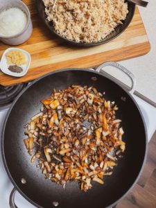 Caramelized onions are so good. Onions cooked for a long time over low heat until their natural sweetness has been developed to perfection. If you want to read some tips and tricks for caramelizing onions perfectly, check out my recipe here, but for this dish, you can cook the onions for anywhere between 7-25 minutes, depending on how much flavor you want developed and how much quickly you need dinner ready.