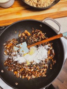 Once the onions are caramelized, season them with a pinch of salt and black pepper and add 2 tablespoons of butter and 2 tablespoons of all purpose flour in with the onions. As soon as the butter has melted, stir and cook for about 60 seconds combining the butter and flour in with the onions.